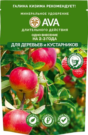 Способ применения: «AVA для деревьев и кустарников» применяется как основное удобрение или совместно с органическими. При посадке равномерно распределите гранулы под растением, для посаженных растений – вокруг растений в зоне активного роста корней.