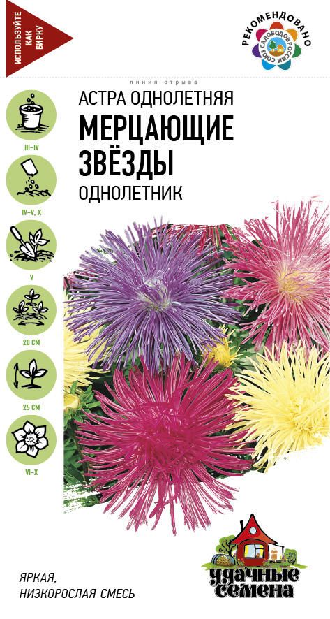 Очень ярка смесь низкорослых игольчатых астр. Растения компактные, кустики ветвистые, высотой 25 см. Цветение начинается в июне и продолжается до заморозков. Соцветия до 7-8 см в диаметре, разнообразных окрасок. Для выращивания подходят хорошо освещенные участки с плодородной суглинистой или супесчаной почвой. Выращивают, чаще всего, рассадным способом. Семена высевают в марте-апреле, пикируют с развитием первой пары настоящих листочков по схеме 5х5 см, в открытый грунт рассаду высаживают с середины мая до начала июня. Возможен подзимний посев астр: в конце октября на глубину 5-8 см. Сверху посевы мульчируют торфом или опилками на высоту 3-5 см. Весной, в конце марта-начале апреля, посевы раскрывают. Появившиеся в конце апреля всходы будут закаленными, а выросшие растения сильными, устойчивыми к заморозкам и обильно цвести. Используют для оформления бордюров, балконов, цветников. Низкорослые астры идеально подходят для выращивания в широких вазонах и контейнерах.