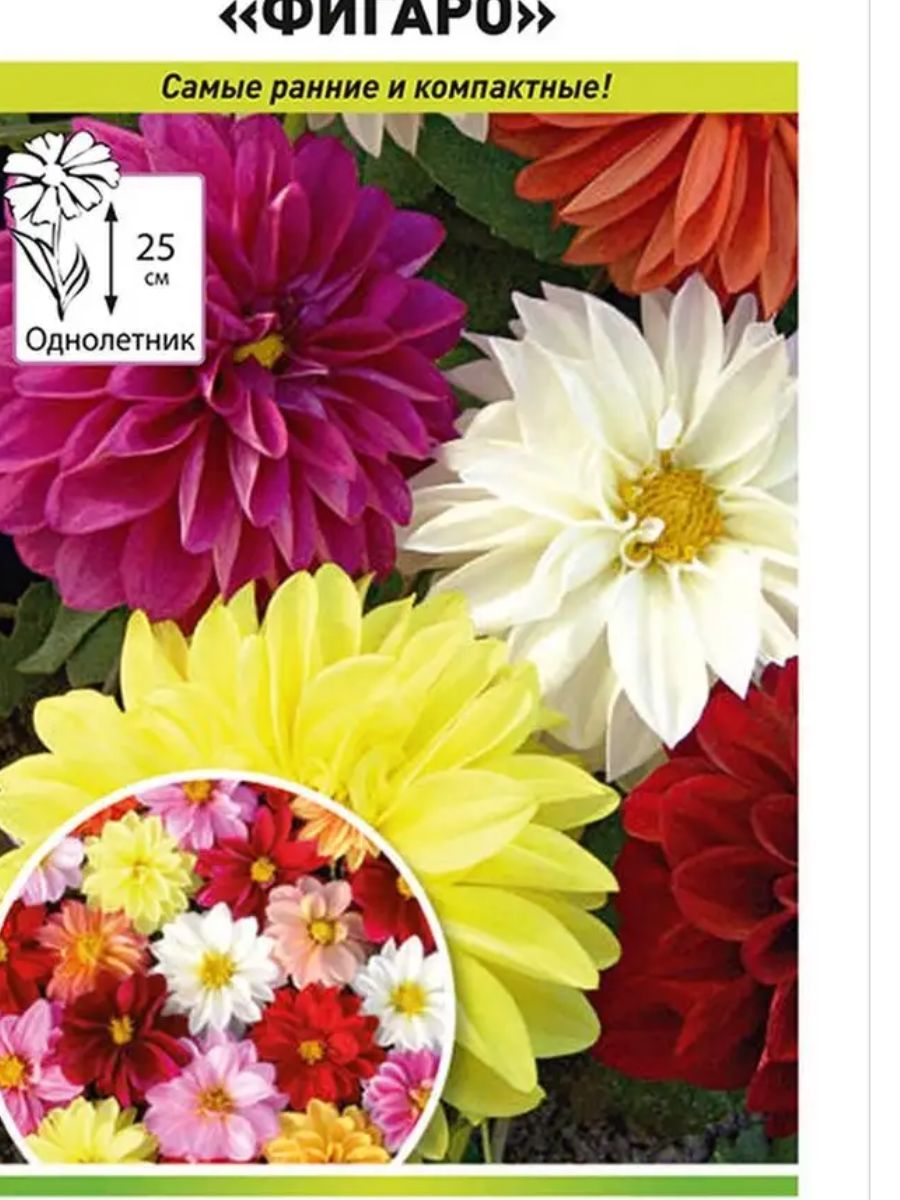 Георгина Фигаро смесь - растение компактное, формирует прямые, прочные, упругие стебли высотой до 45 см. Темно-зеленые перистые листья великолепно сочетаются с яркими, махровыми соцветиями-корзинками, ярких окрасок достигающими в диаметре 10 см. Благодаря компактности, пышному и продолжительному цветению Георгины Фигаро смесь отлично подойдут для создания яркого бордюра, смешанной клумбы, а также для посадки в вазоны и балконные ящики.