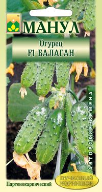 Огурец F1 Балаган - скороспелый партенокарпический корнишонный пучковый гибрид сортотипа Балконный, преимущественно женского или женского типа цветения. Предназначен для выращивания в весенне-летнем обороте на балконах, верандах, лоджиях, в весенних теплицах и открытом грунте. Ветвление слабое; боковые побеги короткие, детерминантного типа. В узлах формируется от 2-3 до 4-6 и более завязей. Зеленцы овально-веретеновидной формы, без ручки, интенсивно-зеленого цвета с продольными светлыми полосками средней длины, с глянцевой поверхностью. Зеленцы короткие, длиной 8-10 см, диаметром 3,0-3,5 см, массой 80-90 г., плотные, хрустящие. Частота расположения бугорков средняя, бугорки средней величины. Вкусовые качества свежих и соленых зеленцов высокие. Гибрид устойчив к оливковой пятнистости, вирусу обыкновенной огуречной мозаики, мучнистой росе, толерантен к ложной мучнистой росе.