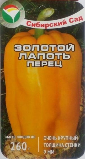 Среднеранний сорт сладкого перца с очень крупными толстостенными плодами. Название «Золотой лапоть» точно характеризует цвет и впечатляющие размеры этих гигантов. Период от всходов до технической спелости плодов 120-125 дней. Растение мощное, раскидистое, высотой 80-85 см Плоды кубовидноцилиндрические, 2-4 камерные, массой 240-260 грамм Б фазе технической спелости светло - зелёные, в биологической - жёлтооранжевые. Толщина мякоти околоплодника 7-9 мм Рекомендуются для употребления 8 свежем виде и домашней кулинарии. Сорт устойчив к вертициллёзному увяданию, рекомендуется для выращивания на приусадебных участках и в плёночных теплицах. Урожайность высокая - 5-6 кг/мг. Культура теплолюбива, требовательна к плодородию и влажности почвы.