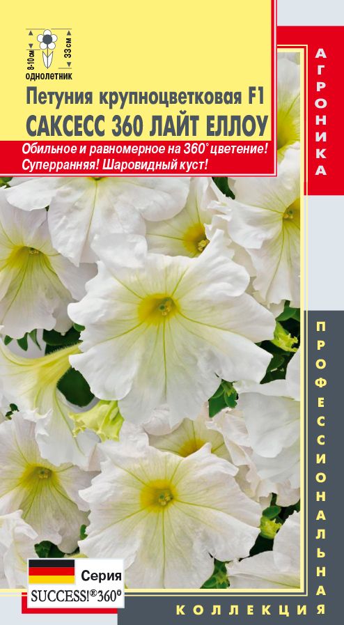 Петунии серии SUCCESS!®360° – это новая ступень селекции в семействе SUCCESS!®. Растения данной серии характеризуются очень ранним началом цветения, габитусом шаровидной формы, толерантностью к длине светового дня, великолепным качеством цветков и обильным цветением! Относительно равномерное развитие кустика во всех направлениях еще в стадии рассады дает быстрое заполнение используемой емкости по всей площади. После пересадки на постоянное место растения одинаково хорошо растут и развиваются как на клумбе, так и в кашпо или контейнерах, сохраняя на протяжении всего периода вегетации выравненную шаровидную форму кустиков. Цветение настолько обильное, что цветки на кустике видны со всех сторон! На все 360°! Высота взрослого растения не превышает 33см, цветки крупные, с волнистым краем, светящейся бело-желтой окраски.