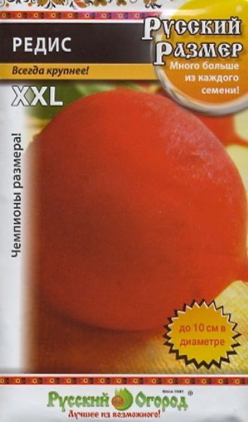 Редис Русский Размер – один из самых крупноплодных редисов! Корнеплод - словно маленькая ярко-пурпурная репка, округлый и овальный, диаметром 10 см, а массой до 400 г! Мякоть белая, сочная, нежная, малоострая. Потрясающий сорт для салатов и весенне-летней закуски! Его любят даже дети!
