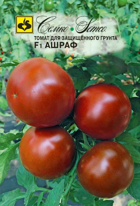 Томат Ашраф F1 - ранний, индетерминантный гибрид для выращивания в теплицах или в открытом грунте. От всходов до созревания 90-95 дней. Растение со средними междоузлиями, хорошо облиственное. Первое соцветие закладывается над 7-9 листом. Помидор округлый, массой 140-150 г, тёмно-коричневый, гладкий, плотный. Мякоть плода на разрезе тёмно-вишнёвой окраски, с повышенным содержанием ликопина. При высоких температурах в летний период помидоры приобретают красно-коричневую окраску. Хорошая завязываемость при высоких температурах. Вкус отличный. Товарность и транспортабельность хорошие. Томат Ашраф F1 устойчив к вирусу томатной мозаики (TоMV), вертициллёзу (Va,Vd) и фузариозу (Fol 1-3). Для потребления в свежем виде. Выращивается в плёночных теплицах или в открытом грунте на шпалере. Густота посадки 2,5-3 раст./м2. Урожайность свыше 20 кг/м2.