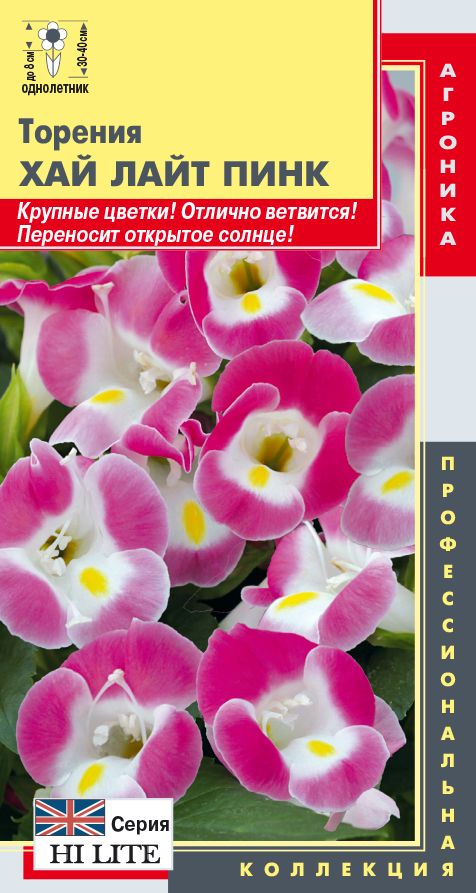 Торения серии Hi Lite идеальный выбор для элитных садовых контейнерных композиций с использованием ампельных растений. Уникальной особенностью сортов серии, в отличии от других сортов, является способность растений переносить палящее солнце и жару без повреждения их пышной листвы и цветков. Также серию отличает великолепный габитус растений, образующийся за счет отличного кругового ветвления на 360° – взрослое растение при длине стеблей 30-40см образуют купол диаметром 40-50см, а необычайно крупные, размером 5-8см, яркие двуцветные розово-белые цветки со светящимися золотыми маячками будут радовать Вас обильным цветением на протяжении более двух месяцев. Хорошо смотрится в сочетании с другими ампельными растениями.